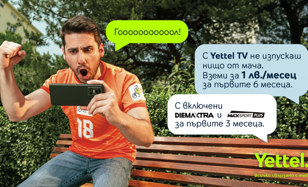 /КРОСС/ С наближаването на Европейското първенство по футбол Yettel TV осигурява страхотна възможност за всички любители на футбола. До края на юли Yettel предлага интерактивна телевизия за 1 лев на месец за първите шест месеца с включени спортните канали на MAX Sport и DIEMA XTRA за 3 месеца, при сключване на двугодишен абонамент. Клиентите на оператора могат да закупят и телевизор на лизинг, като през първите три месеца няма да се дължат лизингови вноски.