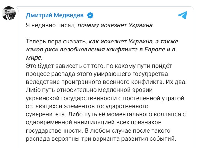 Медведев заяви, че е "очевидно за всички", че няма други реалистични сценарии и добави, че Украйна е "загиваща държава".
