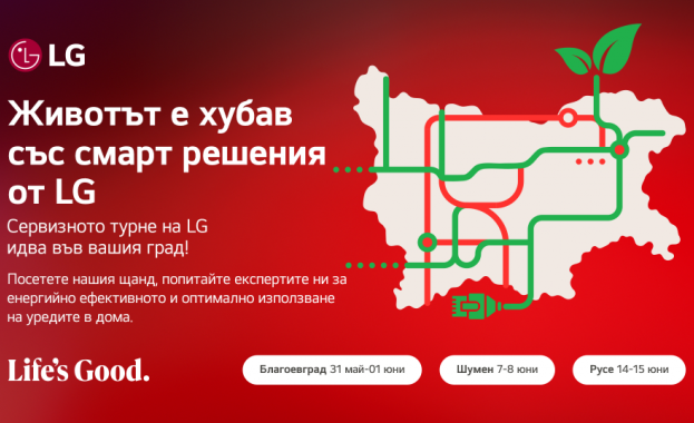 /КРОСС/ Утре, на 31 май, LG Electronics идва в Благоевград, където ще постави началото на третото издание на своето годишно Сервизно турне под мотото „Животът е хубав със смарт решения от LG". В периода 31 май и 1 юни, Благоевград ще бъде първият посетен град, а жителите на града могат да намерят щанда на LG на Площад „Георги Измирлиев". Турнето ще продължи в Шумен (7 - 8 юни) и Русе (14 - 15 юни).