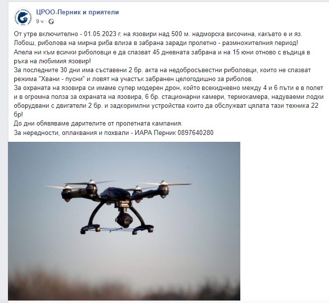 /КРОСС/ Безпилотни устройства с камери ще охраняват язовир „Пчелина" край Радомир в периода, когато риболовът е забранен, съобщават от Централната рибно-опазваща организация-Перник. Всеки ден дронът прави по 5-6 полета над водоема и алармира при наличието на недобросъвестни риболовци.