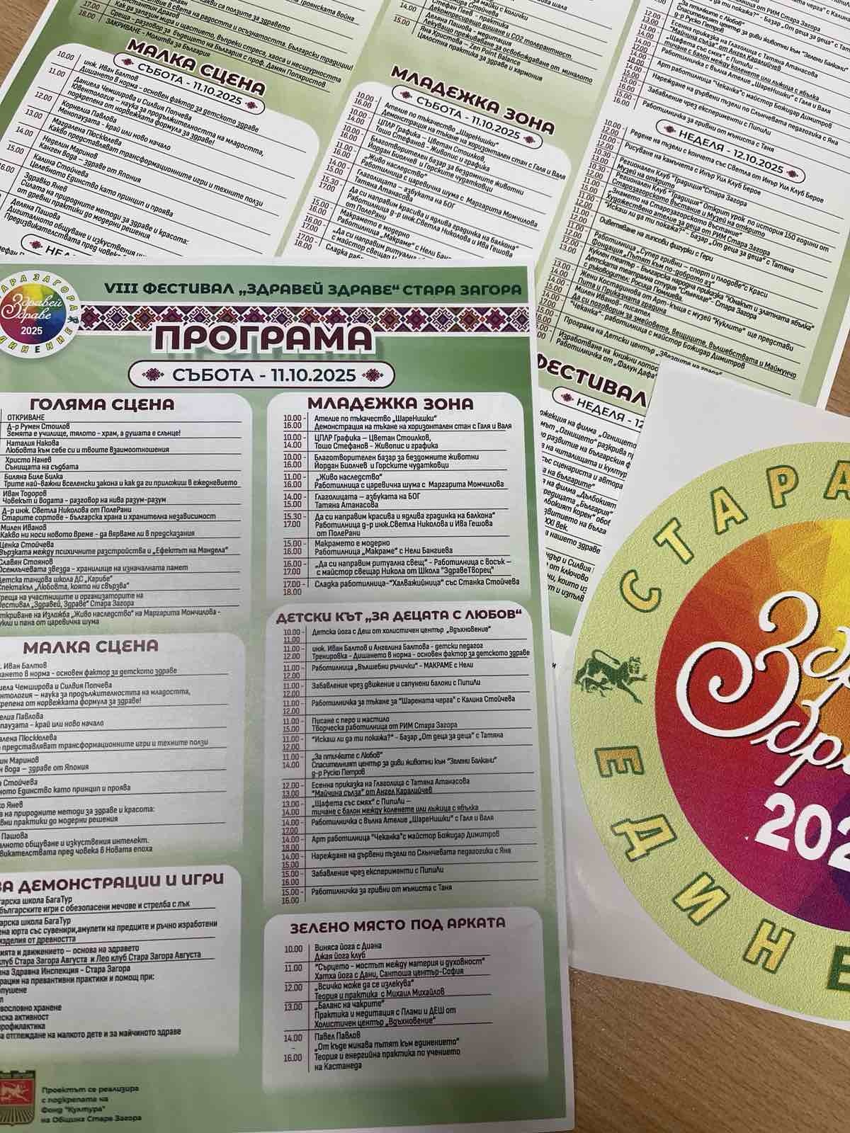 За осма поредна година, в два наситени с мащабна програма дни и с традиционната цел да се повиши информираността и събуди интересът към здравословния начин на живот - на 11 и 12 октомври на Античния форум в Стара Загора ще поздравим отново „Здравей, Здраве"! Фестивалът се организира от Сдружение с нестопанска цел „Здравей, Здраве" и е финансиран по Програма „Култура" на Община Стара Загора.