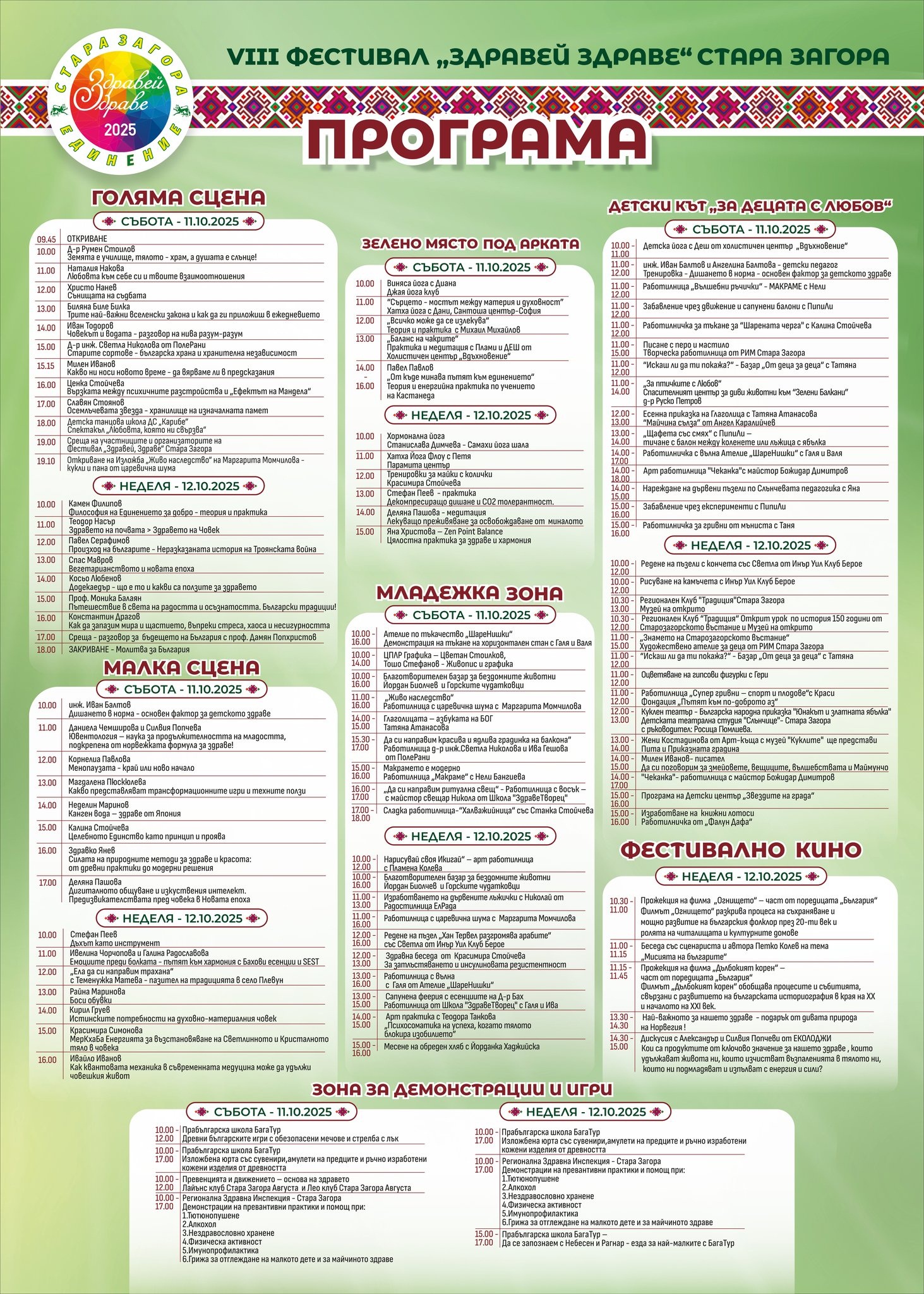 А събитието е наистина впечатляващо по своя размах: две сцени на Античния форум, наречени условно голяма и малка сцена, младежка зона, детски кът „За децата с любов", зона за демонстрации и игри, фестивално кино в Регионалната библиотека „Захарий Княжески"... Новата зона „Зелено място под арката" е отредена за практики и движение: там ще има йога, дихателни упражнения и медитации.