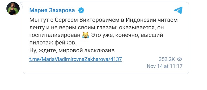 Със Сергей Викторович четем новините в Индонезия и не можем да повярваме на очите си: оказва се, че той е хоспитализиран. Това, разбира се, е лъжа, написа Захарова в своя канал в Telegram, публикувайки и видеозапис от кратък разговор с него по въпроса.
