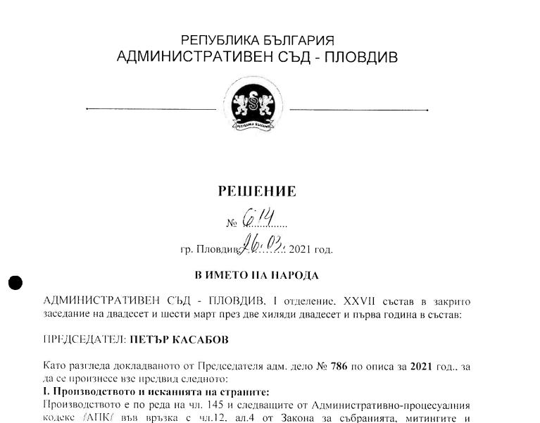 Партия Възраждане оспори заповедта на Мараджиев пред съда и вчера съдът я отмени, като осъди общината да плати разноските по делото, като посочи, че заповедта е в противоречие с материално правните норми и целта на закона. Решението е окончателно. Все пак трябваше съдът да припомни на кмета какво гласят разпоредбите на закона и Конституцията на Република България, с които той вероятно не се е запознал, съдейки по работата му.