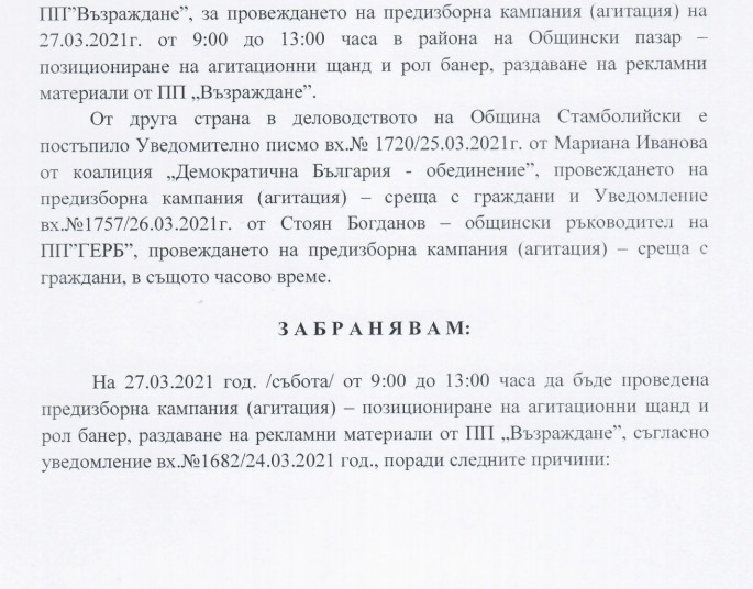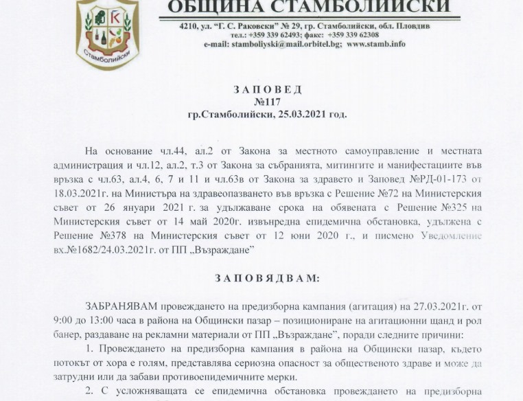 Кметът Мараджиев, в старанието си да даде предимство на своята партия, не се свени да погазва закона и конституционно гарантираните права на гражданите, както и Изборния кодекс. Все пак, човекът е на властова позиция, защо да не помогне? В четвъртък издаде заповед, с която забрани на политическа партия Възраждане да проведе предизборна агитация в град Стамболийски на 27.03.2021 г., защото според него, сме представлявали сериозна опасност за общественото здраве и провеждането на предизборната кампания щяла да затрудни или забави противоепидемичните мерки.