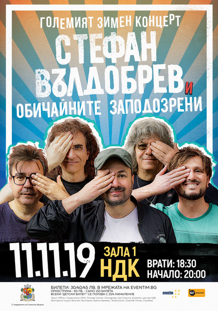 Билети за ГОЛЕМИЯ ЗИМЕН КОНЦЕРТ на Стефан Вълдобрев и "Обичайните заподозрени" на 11 ноември в зала 1 на НДК се продават с пълна сила в системата на Eventim.bg. Цената им е от 30 до 45 лв. В оркестрина - 60 лв. Деца до 7 години, включително, влизат безплатно без право на седящо място, придружавани от родител или нотариално упълномощено от родител лице. Деца между 8-14 години ползват 25% отстъпка (детски билет). Наличието на легитимен пълнолетен придружител е задължително.