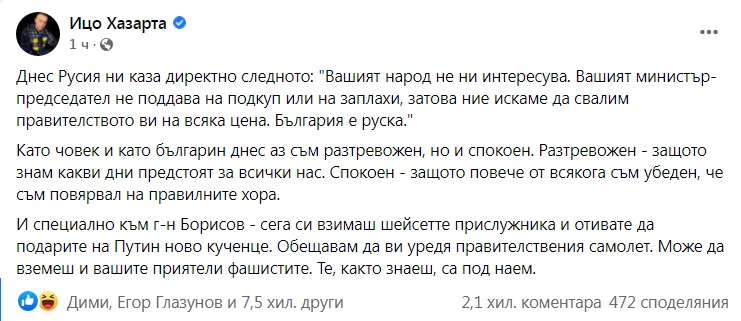 Ицо Хазарта: Сега Борисов и прислужниците могат да подарят на Путин ново кученце