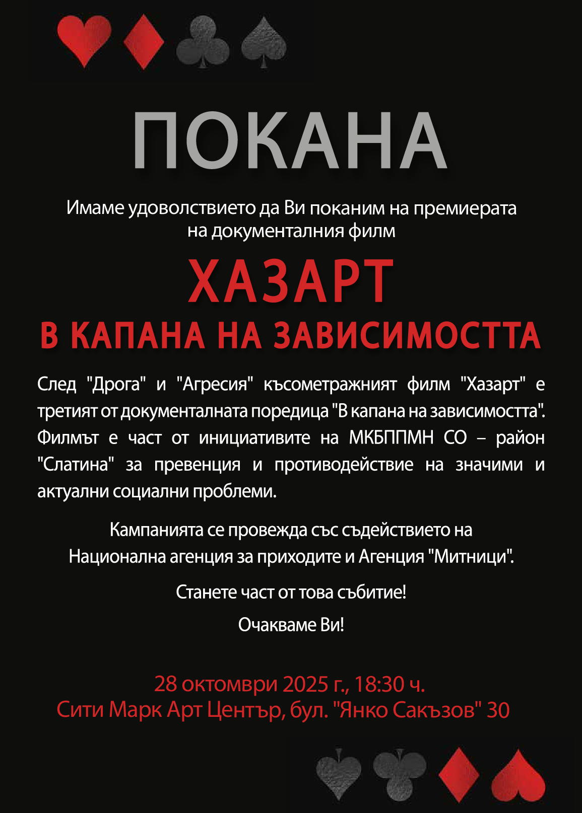 На 28 октомври 2025 г., от 18.30 часа в Сити Марк Арт Център, гр. София, бул. Янко Сакъзов 30, ще се се състои премиерата на документалния филм „ХАЗАРТ. В КАПАНА НА ЗАВИСИМОСТТА" - третата продукция от поредицата, реализирана по инициатива на Местната комисия за борба срещу противообществените прояви на малолетни и непълнолетни (МКБППМН) към СО - район „Слатина".