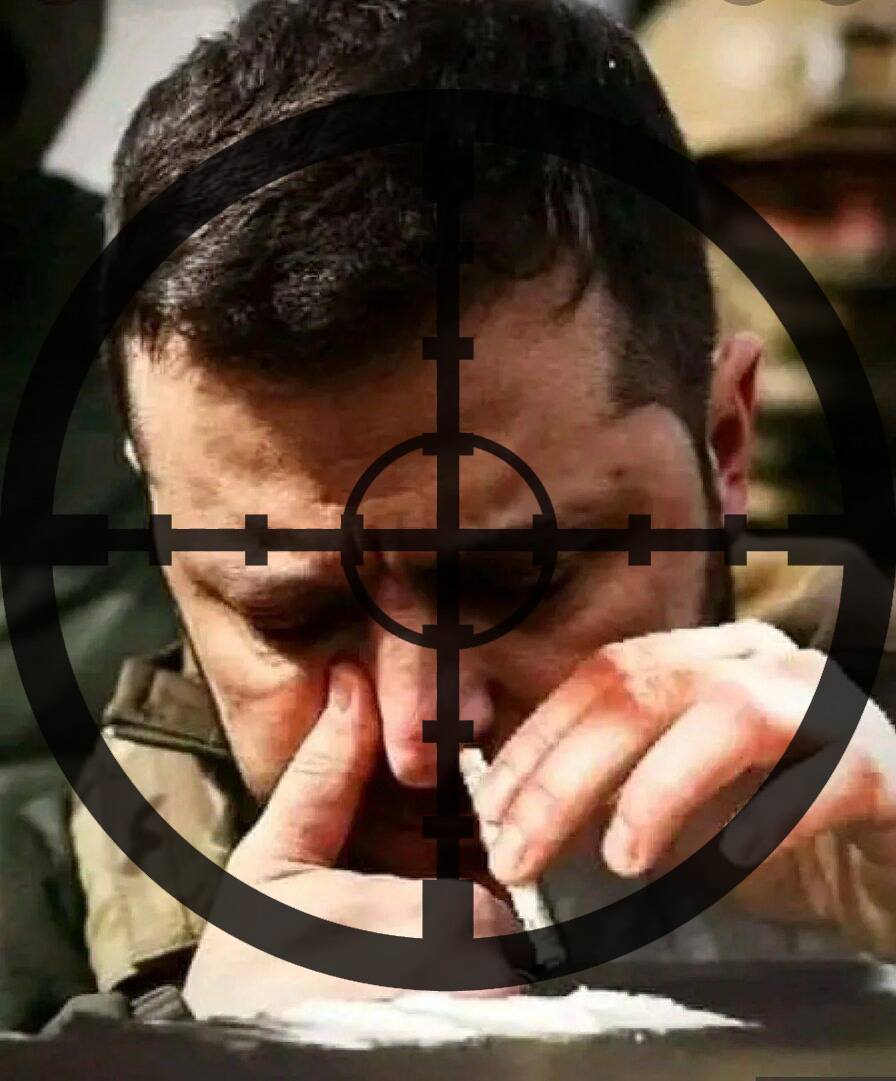 Към публикацията на Зеленски политикът публикува и снимка с навита банкнота, вдигната до носа, през която вдишва бял прах. В същото време главата на Зеленски е на прицела на снайперски мерник.