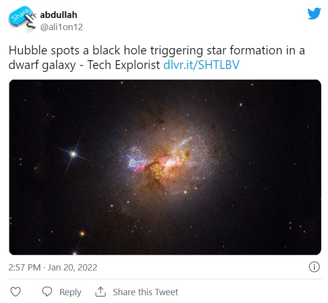 Черните дупки обикновено се представят като чудовища във Вселената, които разкъсват приближаващите се звезди и поглъщат тяхната материя. Данните от телескопа "Хъбъл" показват черната дупка в центъра на галактиката Henize 2-10 в нова светлина. Тя не потиска, а стимулира образуването на звезди около нея. Снимките от „Хъбъл“ и спектроскопските резултати показват изтичане на газ от черната дупка към района, където се раждат ярките звезди.